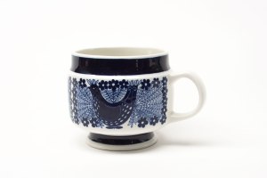 Recently I came across a few of these stunning, extra large chocolate cups. The design is “Sinilintu” or Bluebird by Raija Uosikkinen, in production 1966 to 1975. The striking and bold design of a blue bird amongst flowers and ferns, is beautifully intricate and detailed.