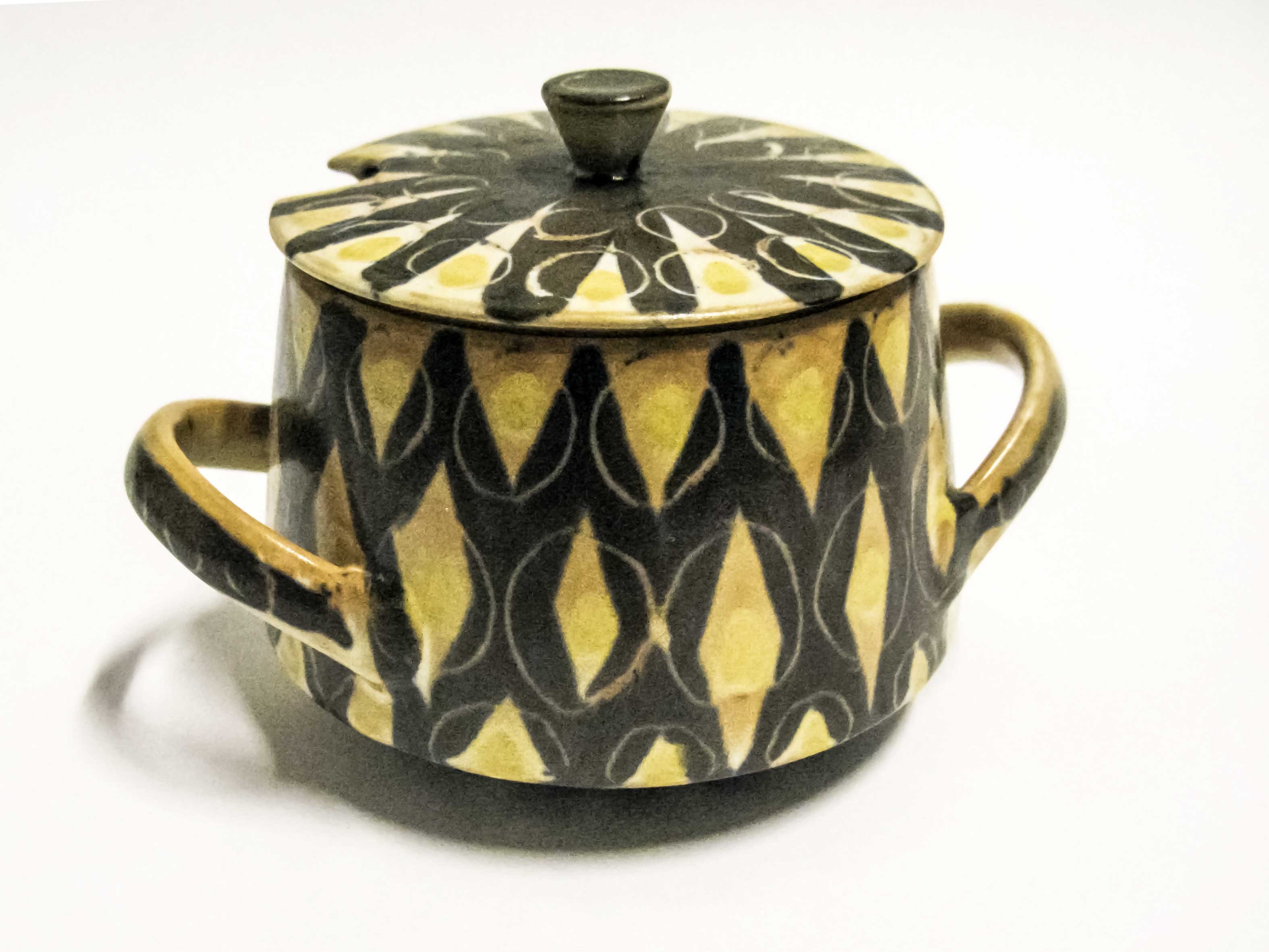 The first series of work which Ady produced in the 1950s as a professional potter, was a yellow and black design in various patterns and shapes. This proved to be a popular and enduring design.