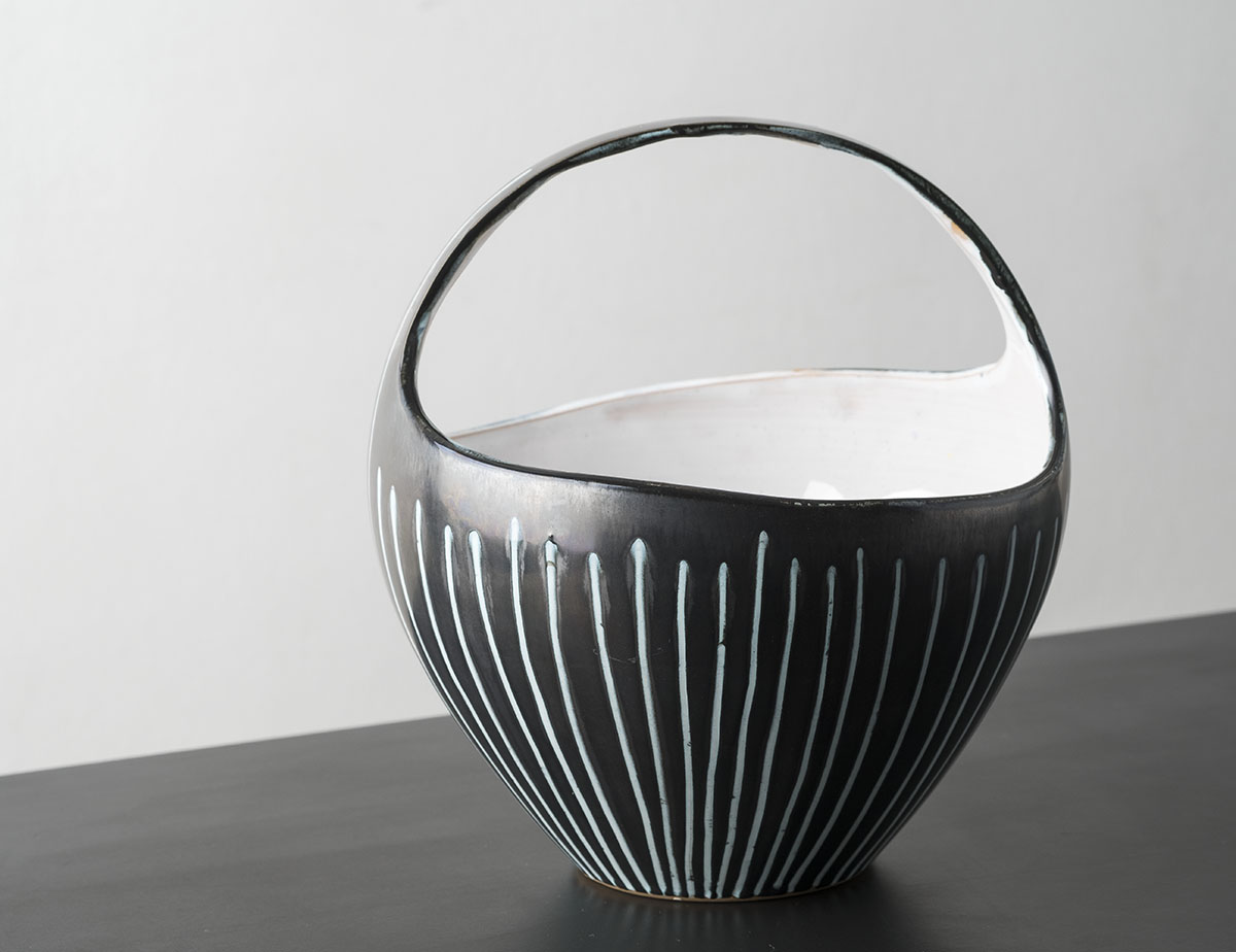 Ady Krøyer, Håndrejet krukke i blåler med sort matglasur udvendig og stregdekora- tion i hvid tinglasur. Indvendig hvid tinglasur. Iltende brand 1020. Diameter 42,5 cm. / H. 19,5 cm. Tekst: Keramiker Tine Møller-Lauesen Foto: Fotograf Kurt Rodahl Hoppe