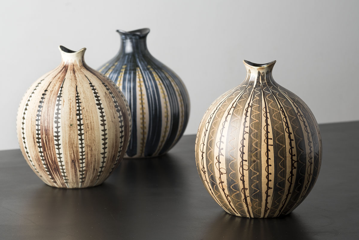 De 2 brunstribede vaser (forrest) blåler med hvid helbegittet korpus. Penseldekorationd i jernbegitning med indridsning i strøgene og stregdekorationen med manganoxyd. Den blåstribede håndrejede vase med udkravet munding hvdbegittet korpus med penseldekoration i forskellige begittefarver og indrid- sninger i blå begitning. Fælles for alle 3 glaseret med halvmat transparent glasur. Iltende brand 1020.