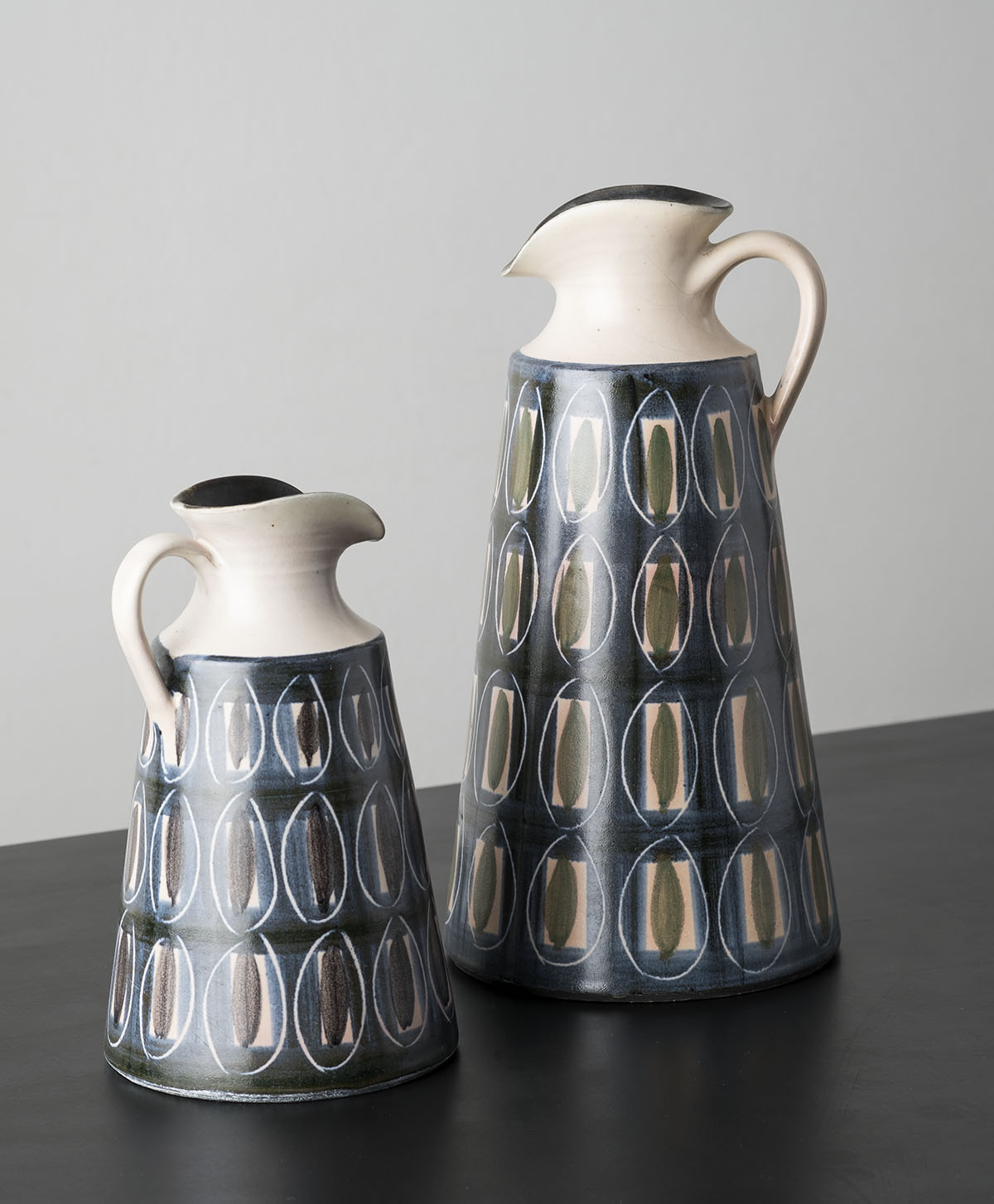 Håndrejede kander med påmalet begittedekoration i forskel- lig indfarvning og indridset mønster. Indvendig sort mat glasur. Udvendig transparent matglasur. Iltende brand 1020. Mål: Stor: D. 40 cm. H. 24,5 cm./ Lille: D 33 cm./ H. 17,5 cm. Tekst: Keramiker Tine Møller-Lauesen Foto: Fotograf Kurt Rodahl Hoppe