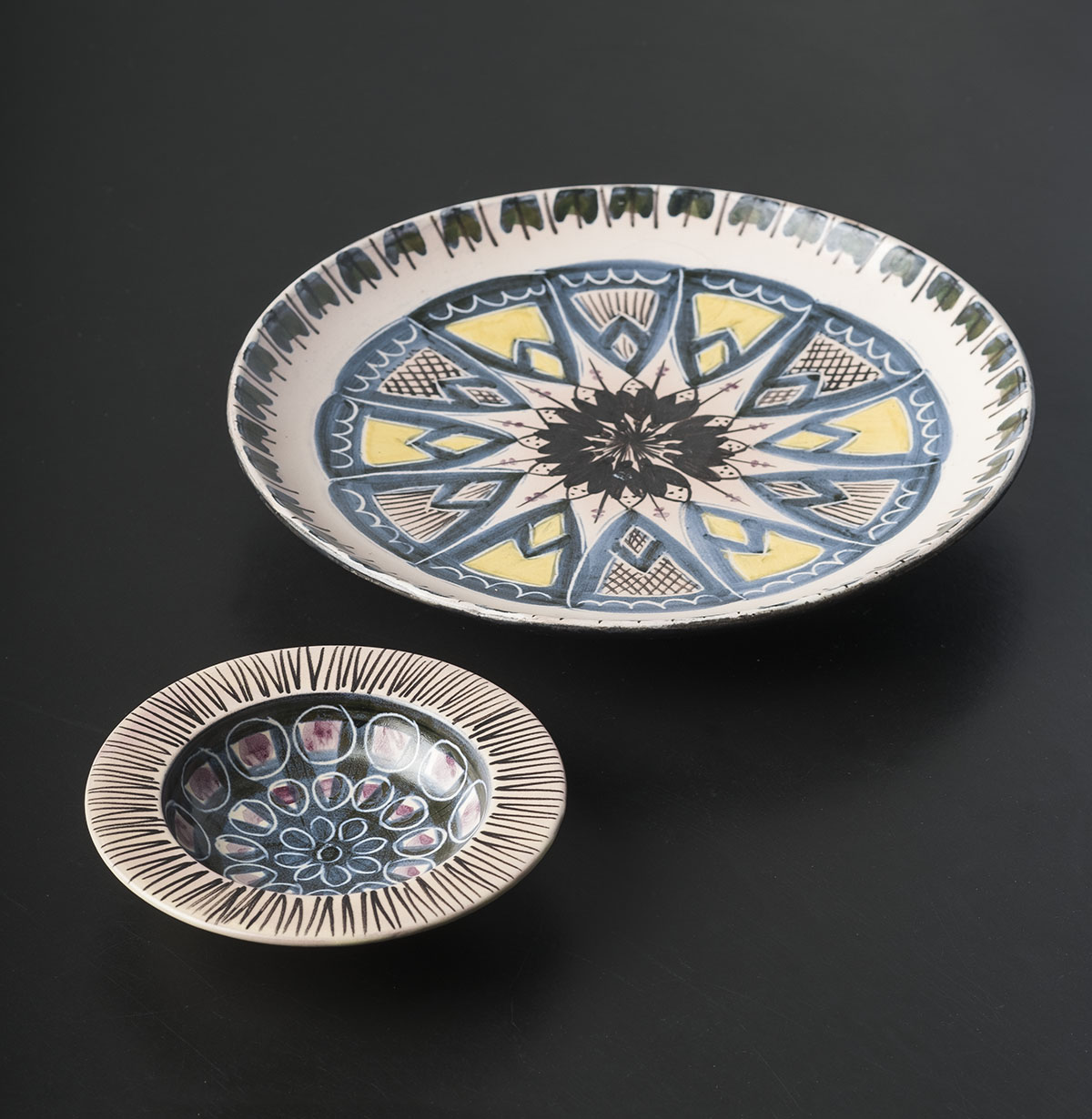 2 håndrejede fade i blåler hvidbegittede. Påmalet dekoration i forskellige begitninger suppleret med indridsninger og påmalede streger i oxyd. Glaseret med mat transparent glasur. Iltende brand 1020. Mål: Lille. D. 14,5 cm. H 3,5 cm. / Stor. D 27,8 cm H. 4,5 cm.Tekst: Keramiker Tine Møller-Lauesen Foto: Fotograf Kurt Rodahl Hoppe