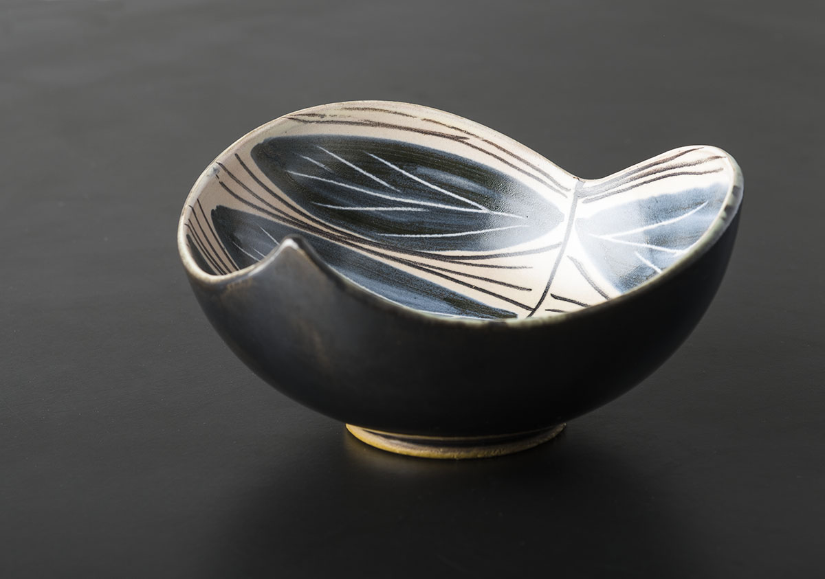 Håndrejede skål i blåler. Tilskåret overkant. Helbegittet. Indvendig penseldekoration i blå begitning med indridsning gennem begitningen og påmalede streger i manganoxyd. Ud- vendig sort mat glasur. Iltende brand 1020.Mål fra spids til spids 15 cm. H. 7,5 cm. Tekst: Keramiker Tine Møller-Lauesen Foto: Fotograf Kurt Rodahl Hoppe