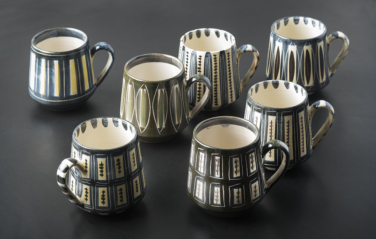 Some of the pottery at Jani Keramik was decorated using a technique of scratching into the clay called “Sgrafitto” and then filling these lines with glaze to build up the colour.  This technique appealed to Ady who often used it later in her own work.
