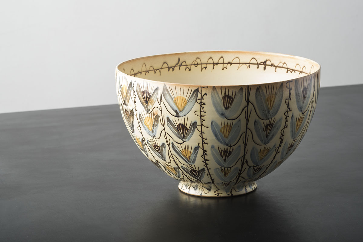 Then came the colourful, complex patterns applied on the top of a satin white glaze, which were produced into the 1970s. Both the forms and the decorations show a whole new level of sophistication and growth by Ady as an artist and potter.