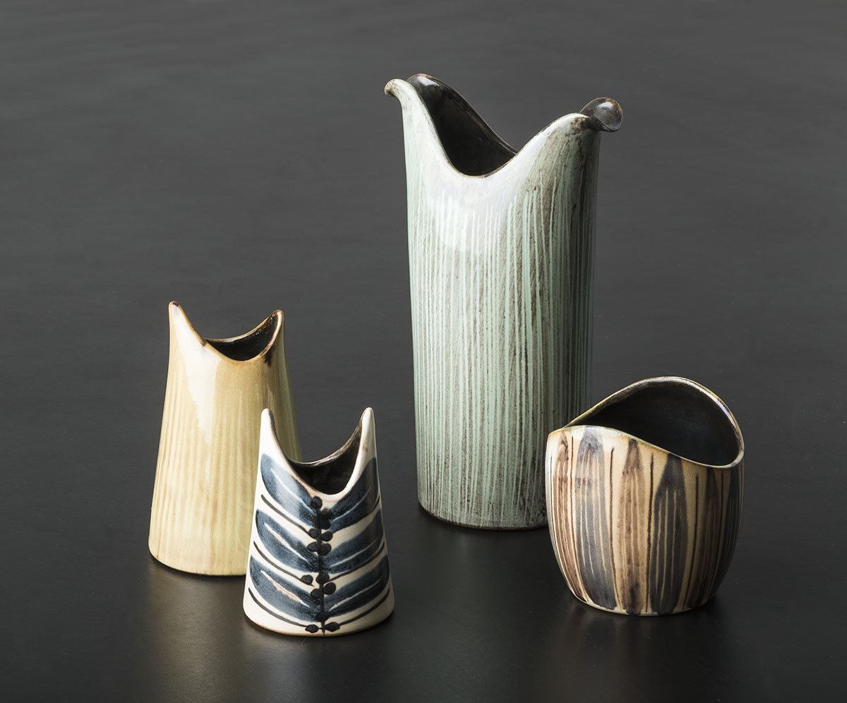 4 hånddrejede krukker med tilskårne øvre kant. Blåler med dekoration i indfarvet begitning med indridsninger (den turkise og gule). De øvrige 2; hvidbegittet med penseldekorationer i jernoxyd og manganoxyd. Iltende brand, 1020.