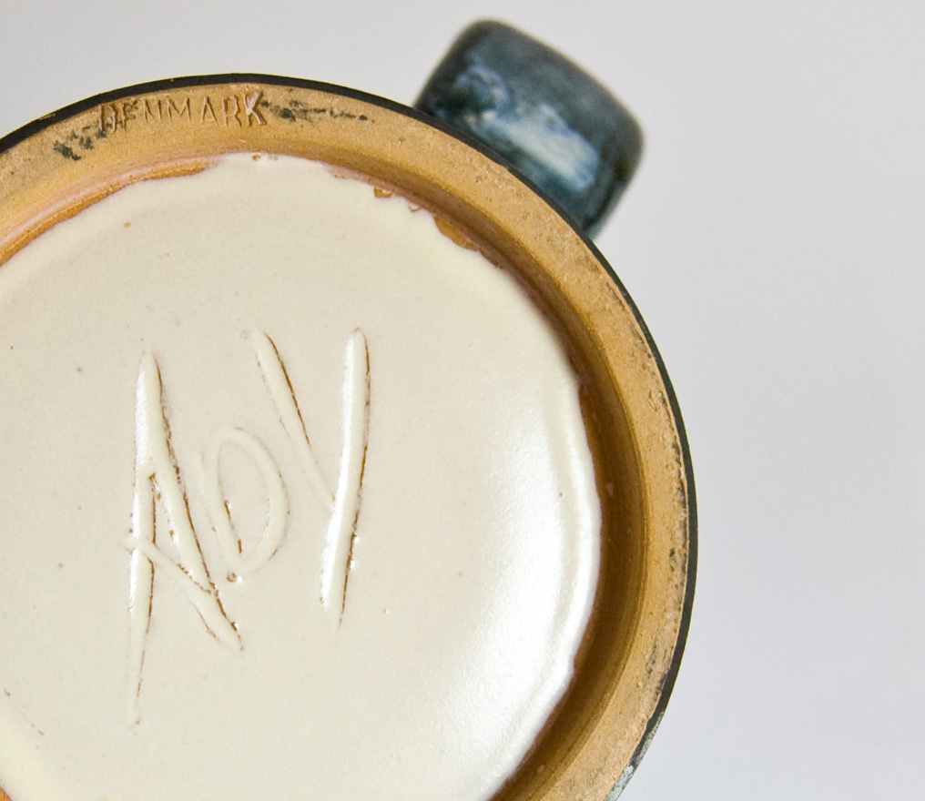 Ady Kroyer’s pottery can be easily recognized with “Ady” hand carved to the base. For about a period of about 1 year only Ady used her married name and you may come across pottery inscribed Ady in the centre, with Kroyer Johansen carved around it.