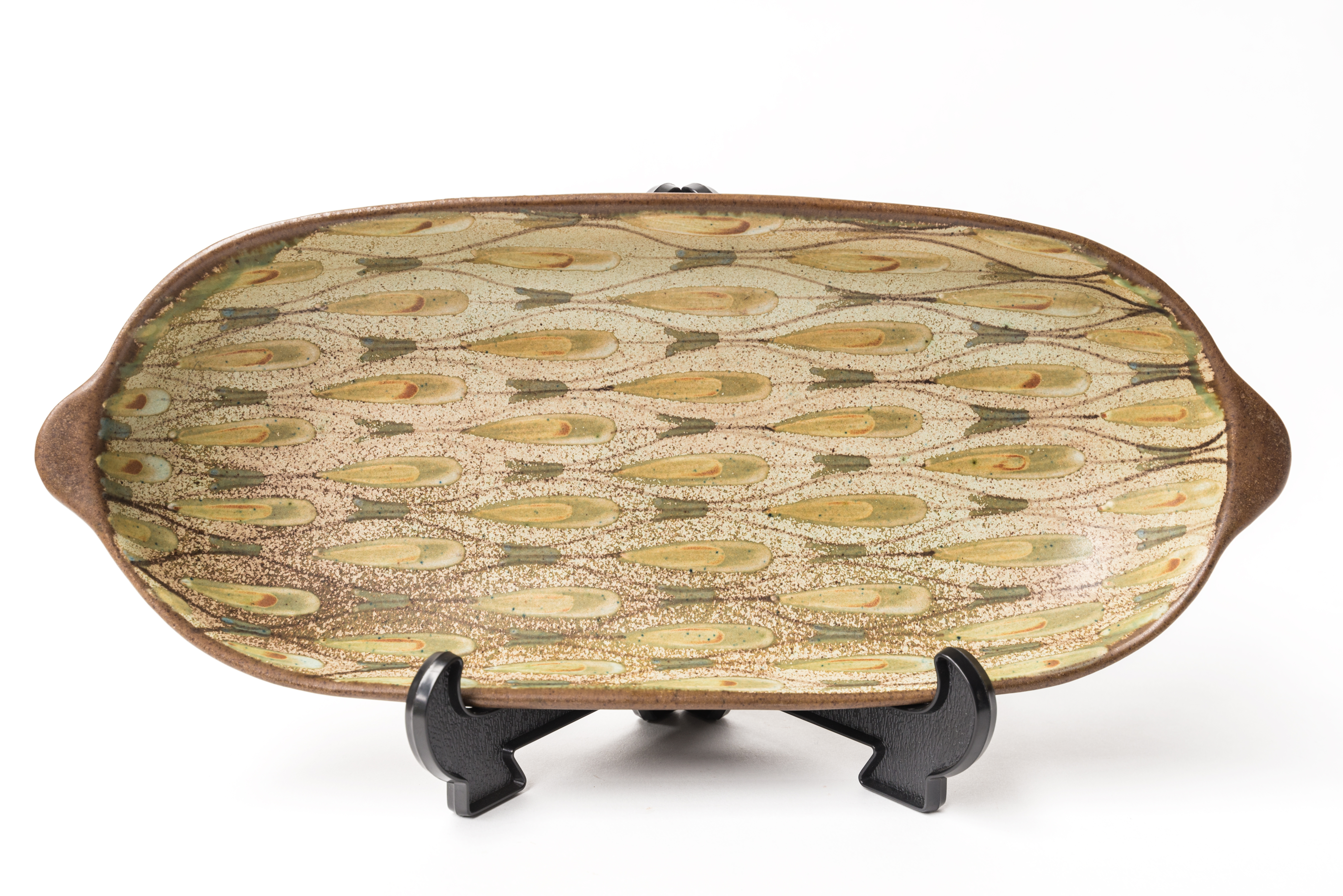 Other popular items include tiles, bowls, dishes, sculptural pieces, and decorative items like large hanging eggs. The Dybdahls sold their pottery from their workshop and also from Den Permanente. They did not have an agent and sold everything themselves. They exported overseas regularly as well.