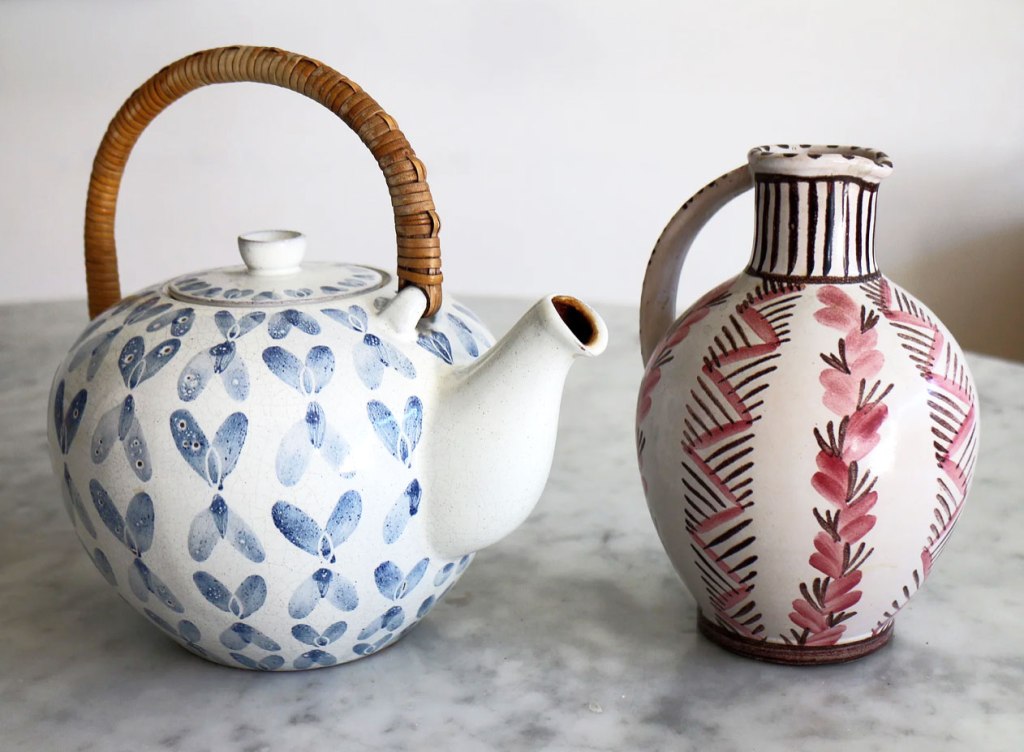 The pieces are earthenware fajance, glazed with a white tin base glazed and then hand painted with an overglaze pattern.