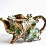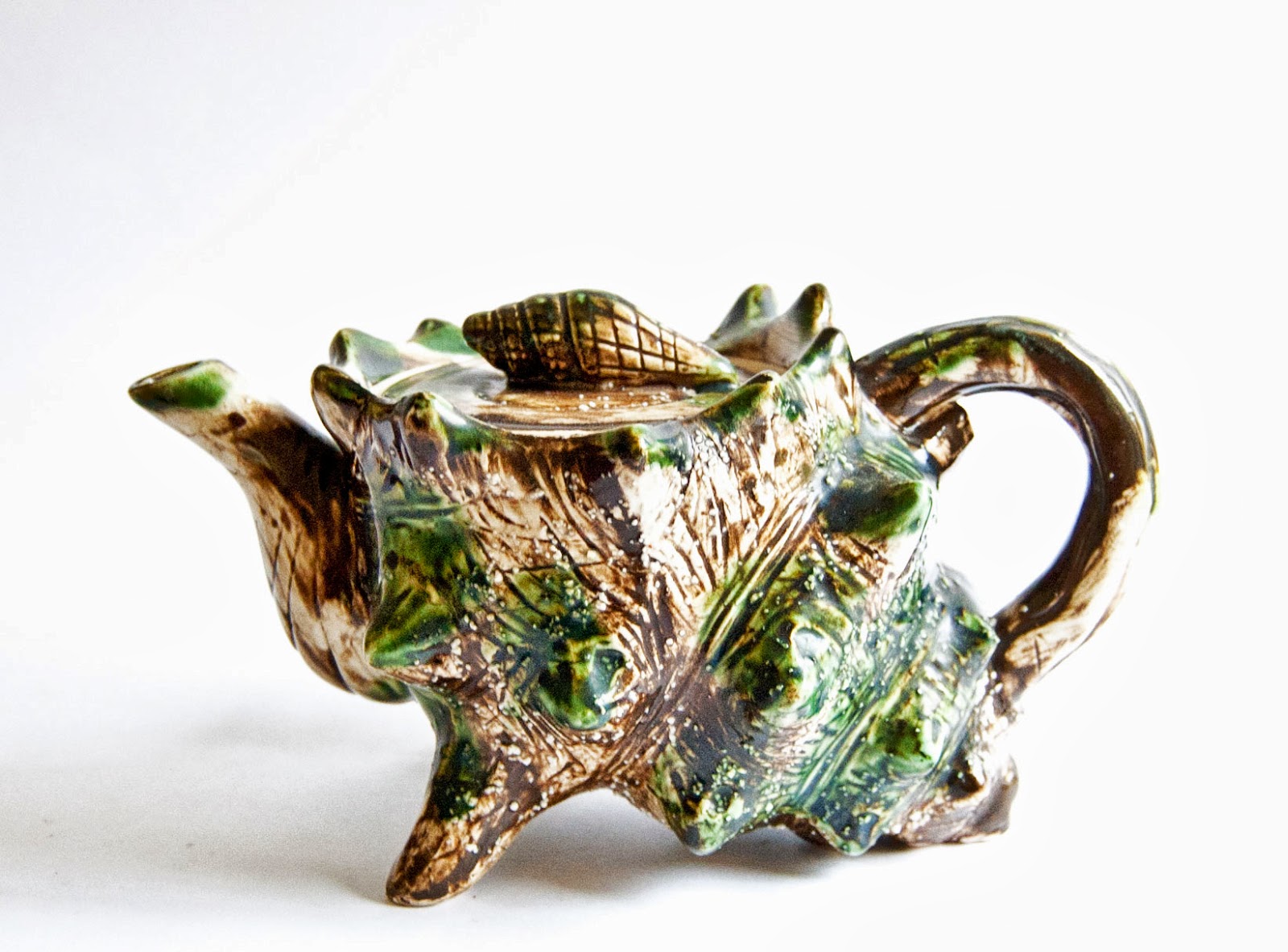 I just had to buy this bizarre looking and quite Surrealist teapot as soon as I discovered it listed on Etsy several years ago – It is just so over the top – and so bizarre – Ive never seen anything quite like it. A large sea shell, covered in seaweed, barnacles, shellgrit and more – just as if it had been lifted out of the ocean. Its actually very well made and decorated considering it was made as “Tourist Ware”