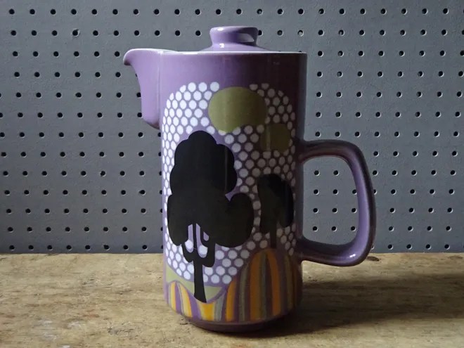 The shapes the design is placed on you may recognise immediately as the forms Gill Pemberton designed for “Chevron” in the 1960s. The “Trees” design was placed on all of the forms of Chevron including the steel handled teapot, coffee pots, lidded forms, bowls, plates and dishes.