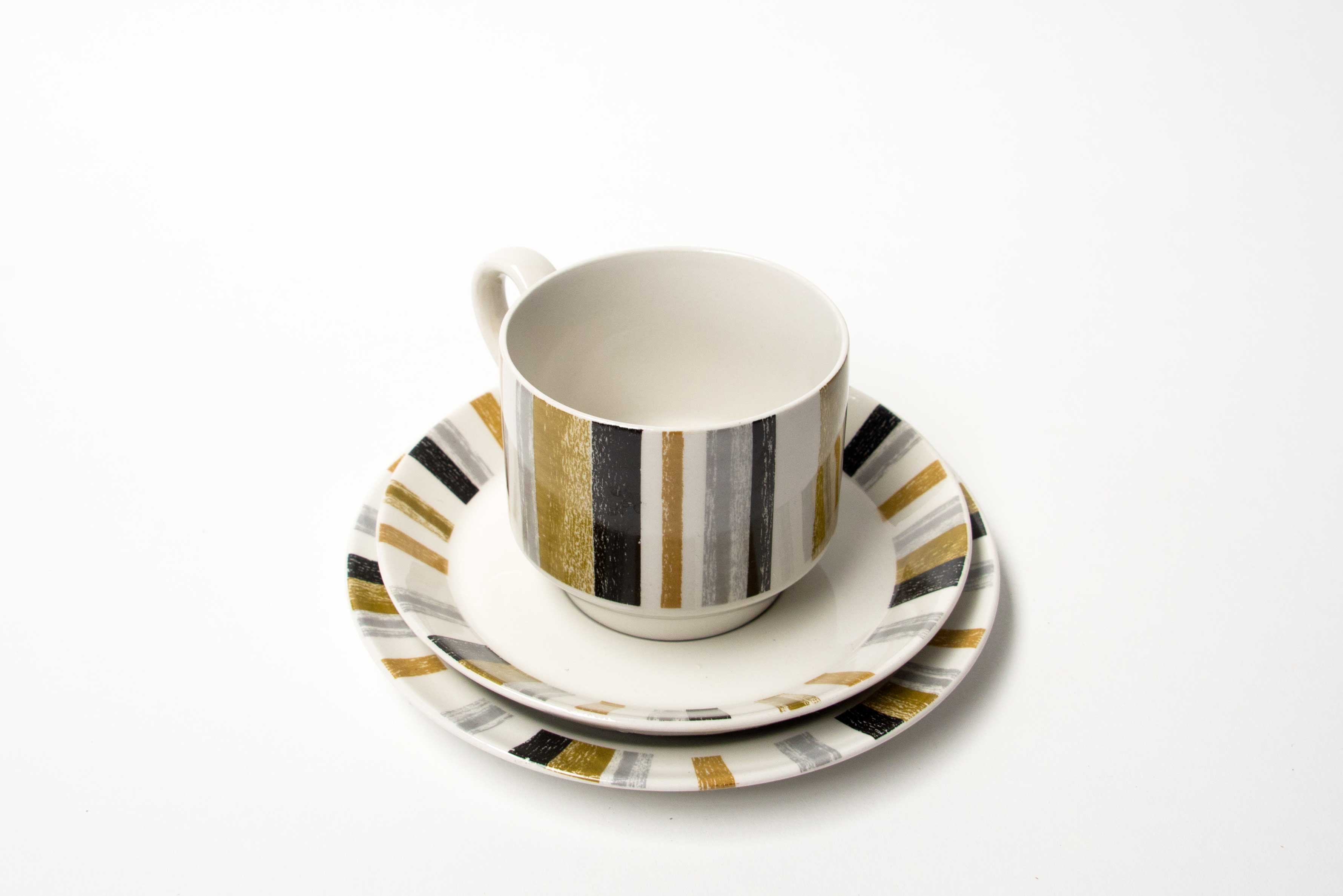 Midwinter “Queensberry” was the first a series of very popular striped patterns introduced by Midwinter (and many other manufacturers) in the early 1960s. It was in production 1962-1978 on the “Fine” Shape.